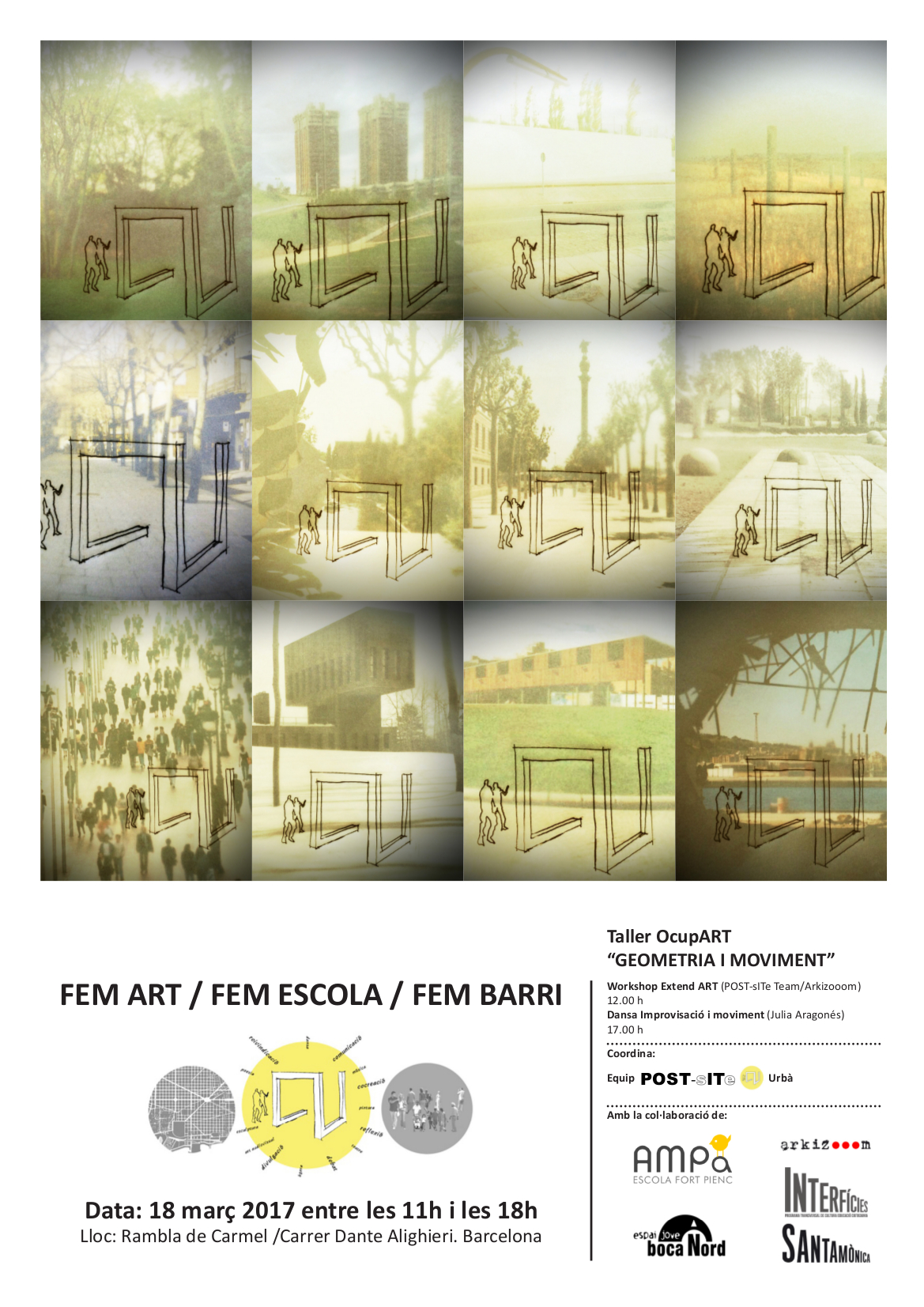 Interfícies és el programa d'educació, ciutadania cultura d'Arts Santa Mònica. L'equip 'Equip POST sITe Urbà és un dels 3 equips creats dins de programa formatiu de "Ciutat educadora i educació viva" desenvolupat per Interfícies. Aquest és un equip interdisciplinari d'arquitectes,dissenyadors, educadors i gestors, que desenvolupa el projecte "FEM ART /FEM ESCOLA / FEM BARRI ", dissenyat entre totes les persones durant el curs. Aquest projecte està vinculat i en continuïtat amb el projecte "FEM ESCOLA / FEM BARRI "impulsat pel AFA Fort Pienc des de l'any 2008. Aquesta acció es una de les 3 intervencions de educació i espai públic que es plantejen durant el 2017.