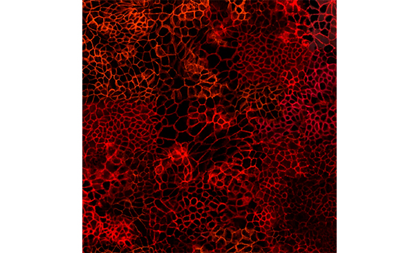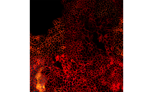 Instal·lació de vídeo generatiu realitzat amb imatge de microscòpia confocal de cèl·lules (col·laboració IRB Barcelona).